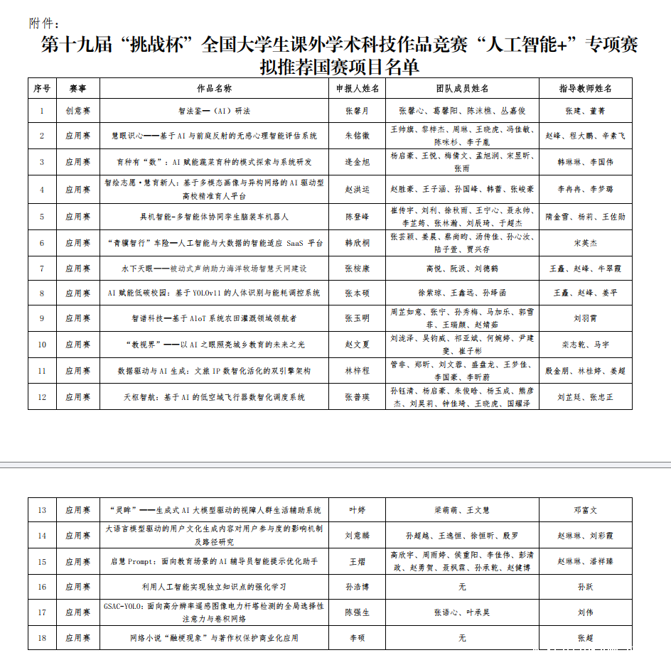附件:第十九届“挑战杯”全国大学生课外学术科技作品竞赛“人工智能+”专项赛拟推荐国赛项目名单